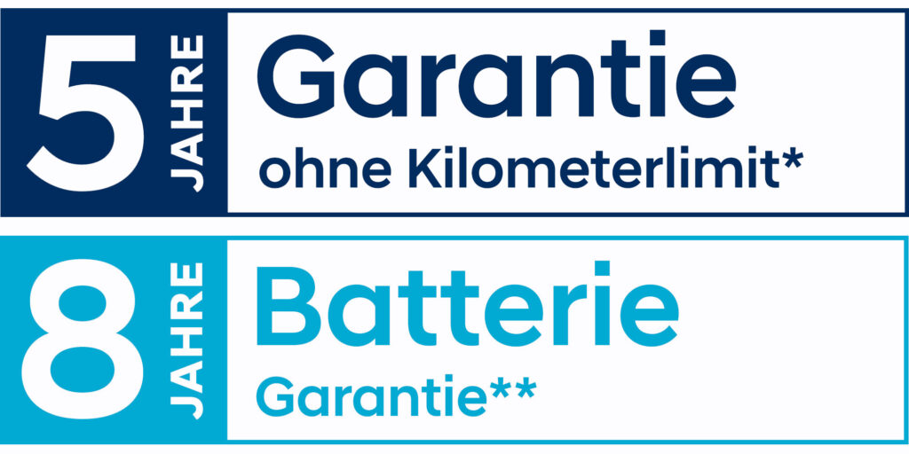 - 8 Jahre Garantie auf die Hochvoltbatterie bis 160.000 km** (Hyundai INSTER, Hyundai KONA Elektro, Hyundai IONIQ 5, Hyundai IONIQ 5 N, Hyundai IONIQ 6 und Hyundai IONIQ 9)